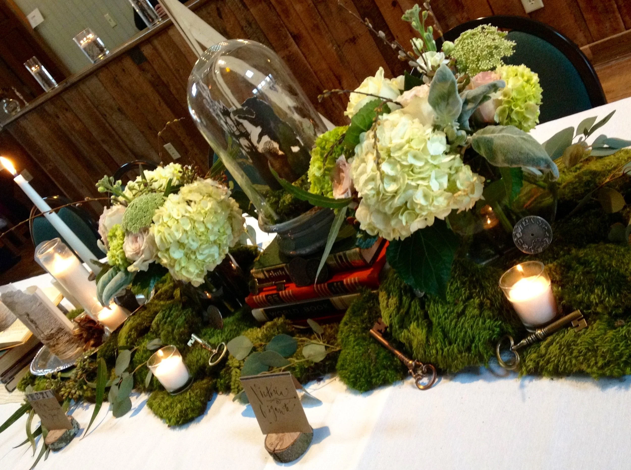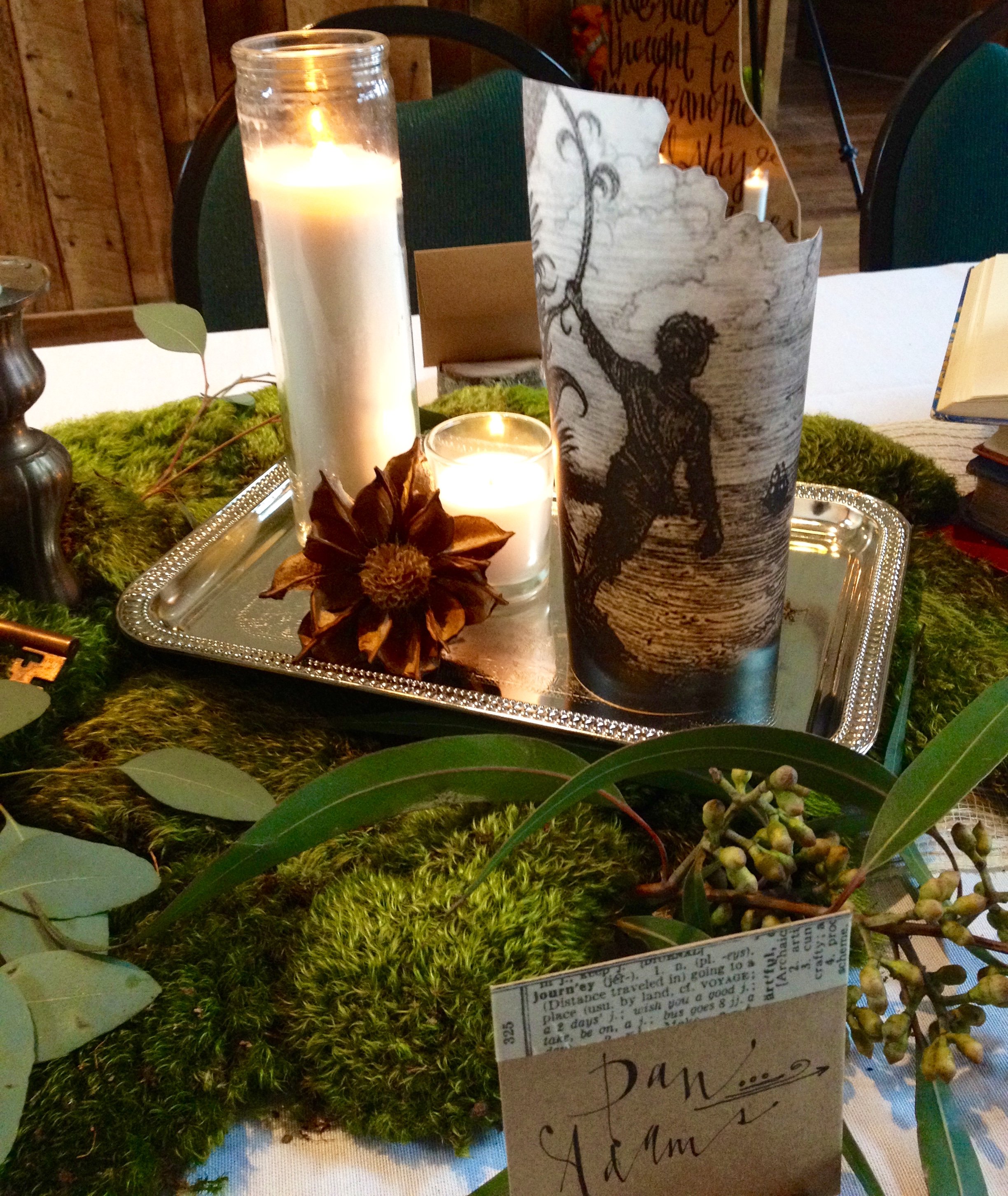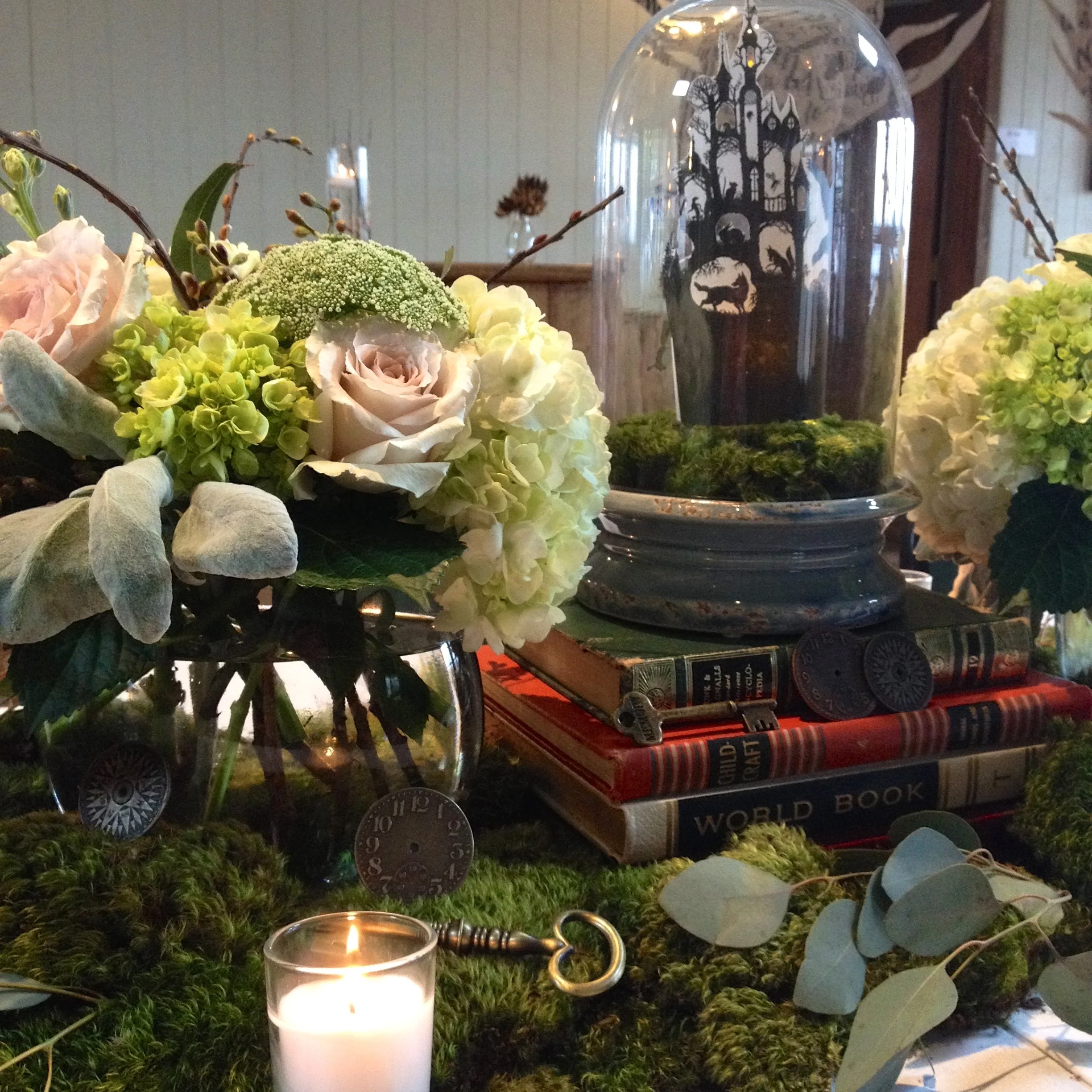 This tablescape design reflects the whimsy of the Neverland themed welcome dinner- using moss, muted colors, antique books, glass cloches with paper lanterns, and tiny magical trinkets.