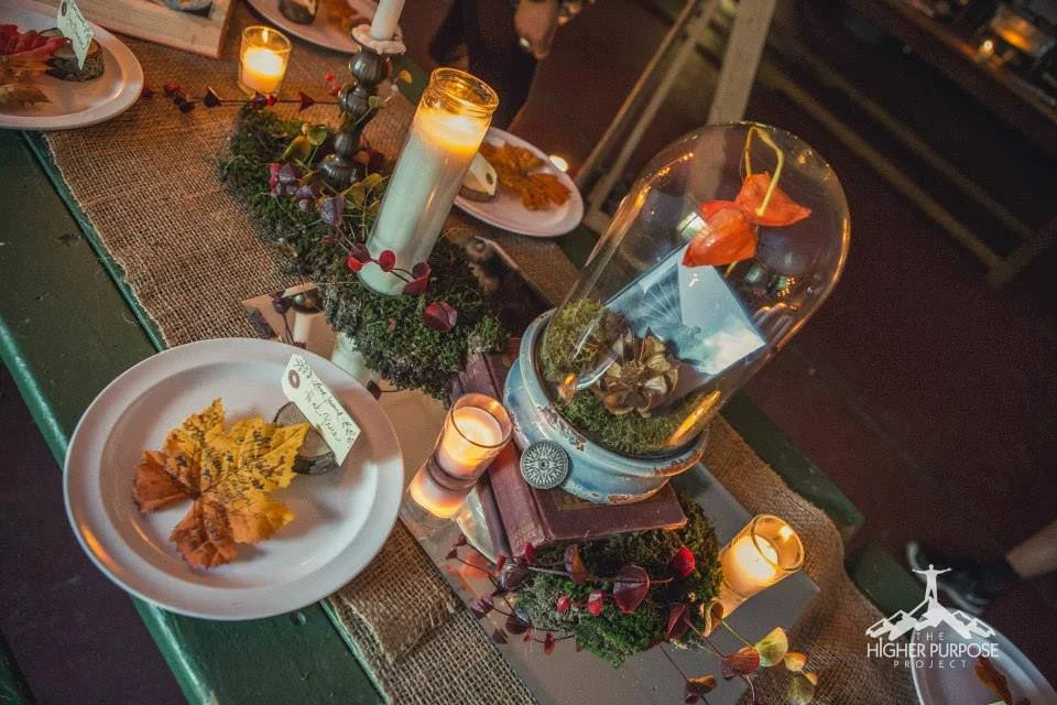 Adventure Welcome Dinner at a summer camp. I used burlap, fall florals, moss, and hand painted menus on leaves to reflect the adventurous tone to this dinner.