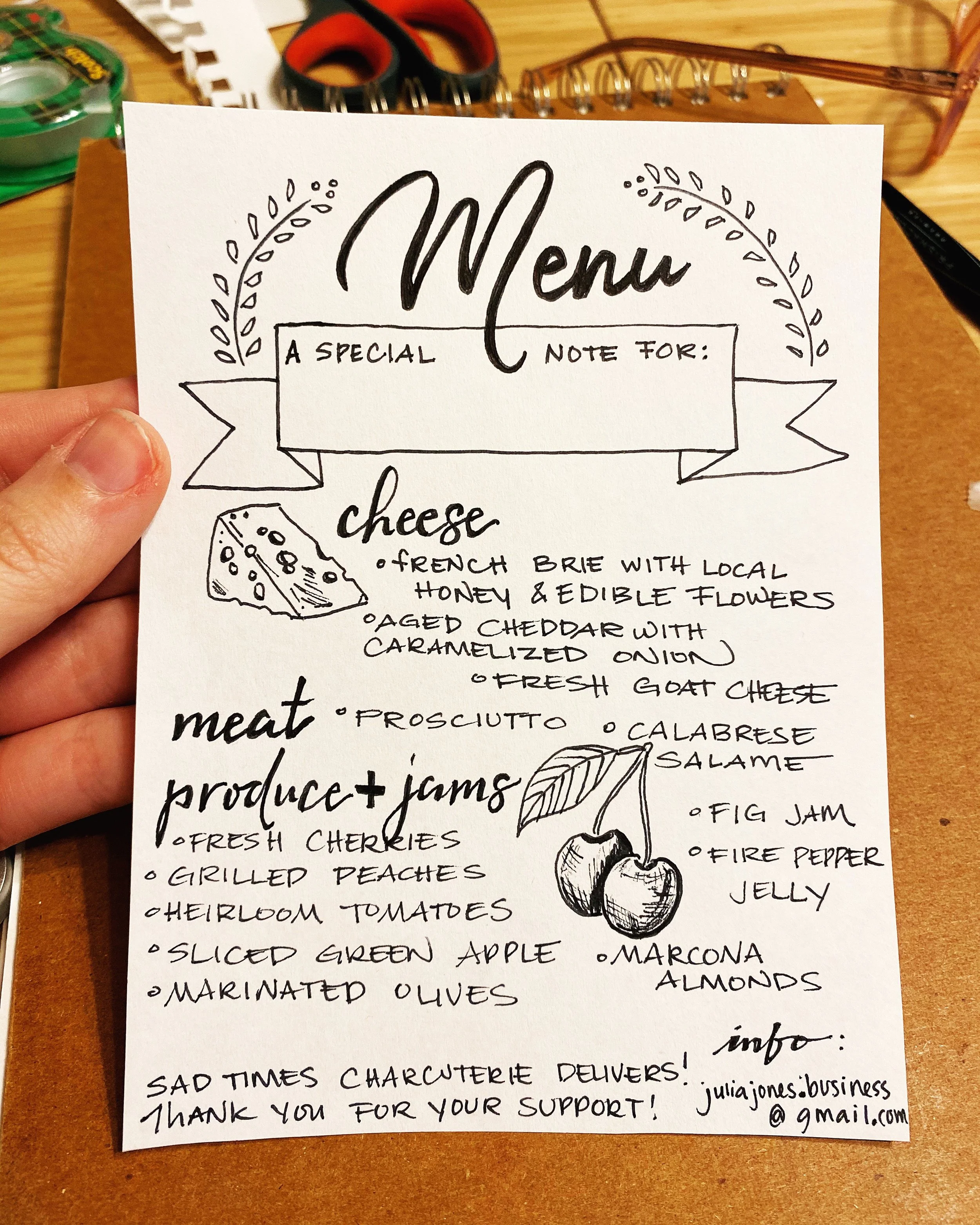 I illustrated this menu for a private event at Souper Jenny’s Farm on the Westside of Atlanta - an outdoor charcuterie board event I was also curating