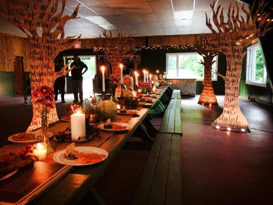 Using a jigsaw, I cut out six 8’ tall trees, mounted them with a brace, and hand painted quotes from the hosts’ favorite book. Since we were at a summer camp, I fashioned wireless “stage lights” to highlight the tress and add ambiance to the camp setting